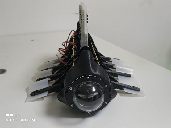 The propulsion mechanism of the wave-like fin is very complex, and its motion varies depending on different propulsion situations. However, during the steady-state swimming phase, it mainly exhibits a quasi-sinusoidal waveform. The three-wave fin structure in this project can use the dorsal fin in coordination with the nine-axis gyroscope module to rapidly reach the steady-state swimming phase of the vehicle. It utilizes the remaining two fins for kinematic calculation of the sinusoidal wave propulsion. This not only provides high-precision motion capabilities and rapid acceleration for even fins at low speeds but also makes control easier and more stable. Figure three depicts a schematic diagram of the propulsion structure.